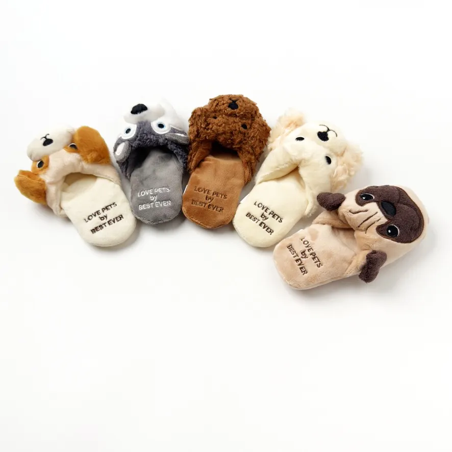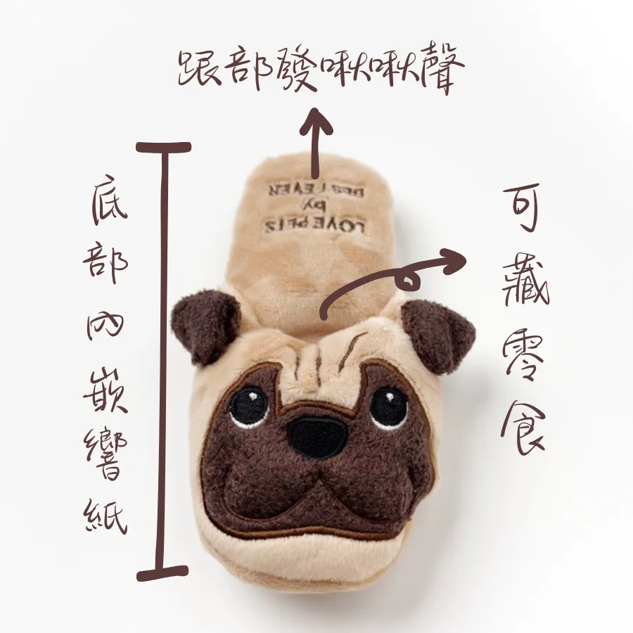這款拖鞋玩具以可愛的狗狗造型設計,融合多種互動元素。拖鞋底部內嵌響紙,咬合或踩壓時會發出沙沙聲響,吸引狗狗的注意力;後跟部加入啾啾發聲裝置,增添更多玩樂趣味。