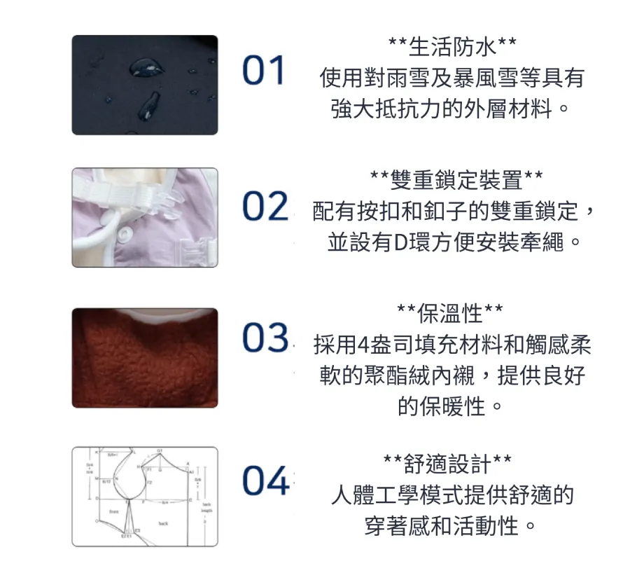 牽繩背心使用生活防水外層,能抵禦雨水和雪,適合戶外時常穿著。
