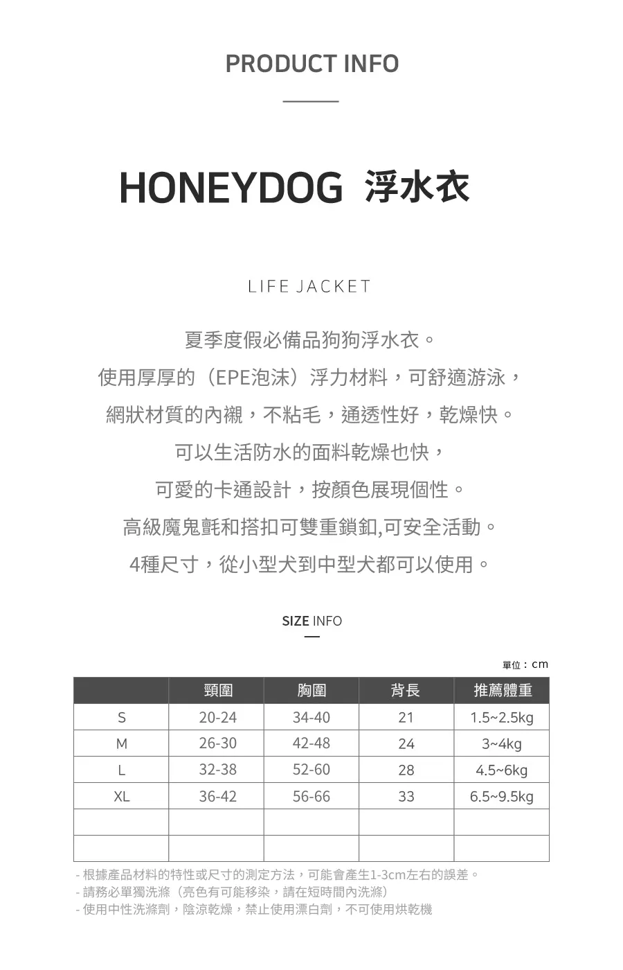 | 尺寸(cm) | 頸圍 | 胸圍 | 背長 | 推薦體重 |