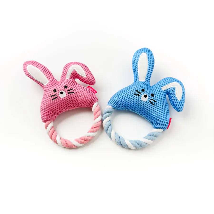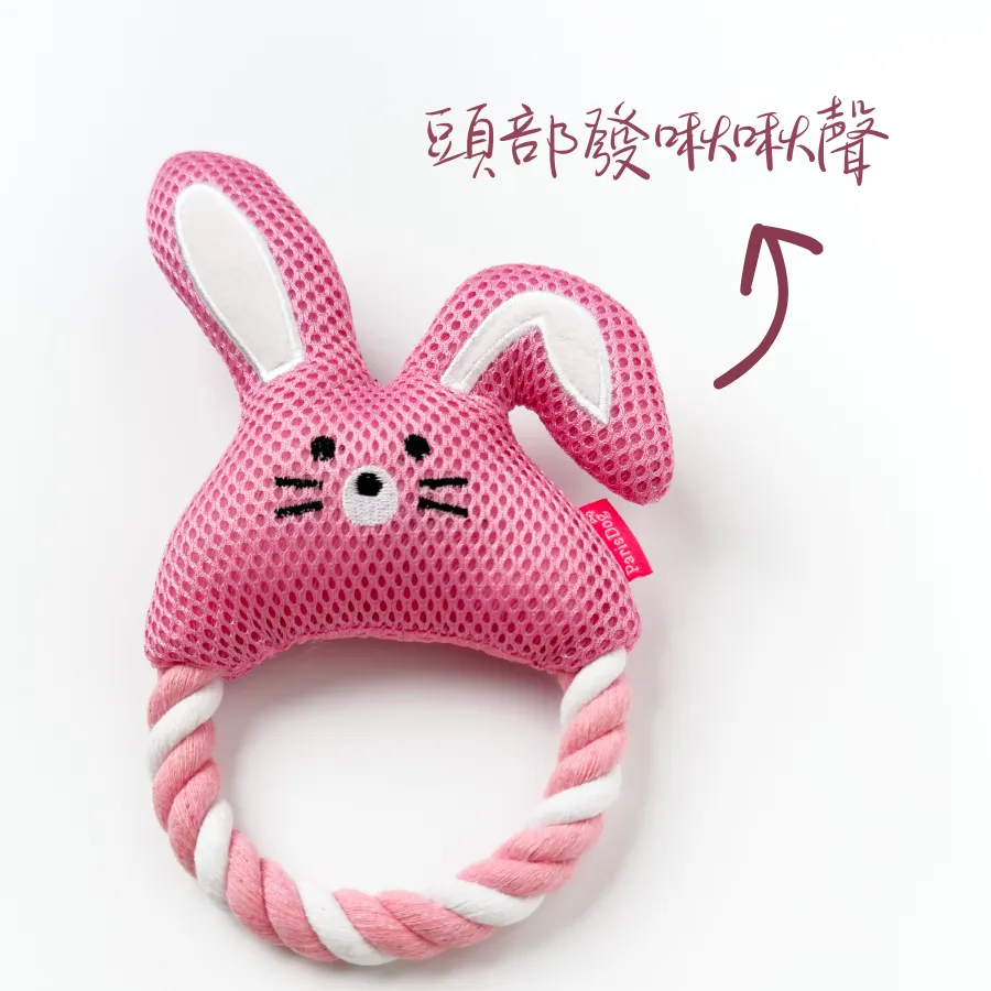 可愛的兔子造型,結合堅韌耐咬的繩結設計、吸引狗狗的發聲功能,不僅滿足狗狗的咬合需求,還能幫助清潔牙齒。輕巧易抓,適合互動遊戲,增進主人與寵物的感情,是狗狗解悶和磨牙的最佳選擇!規格:長*寬 18*11cm顏色:粉色/藍色
