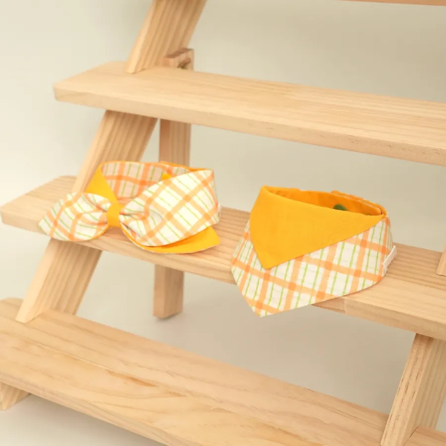 - 黃昏普羅旺斯·蝴蝶結領巾 —— 格紋與暖陽色彩交織,如鄉村午後的悠然步調,優雅而輕快。