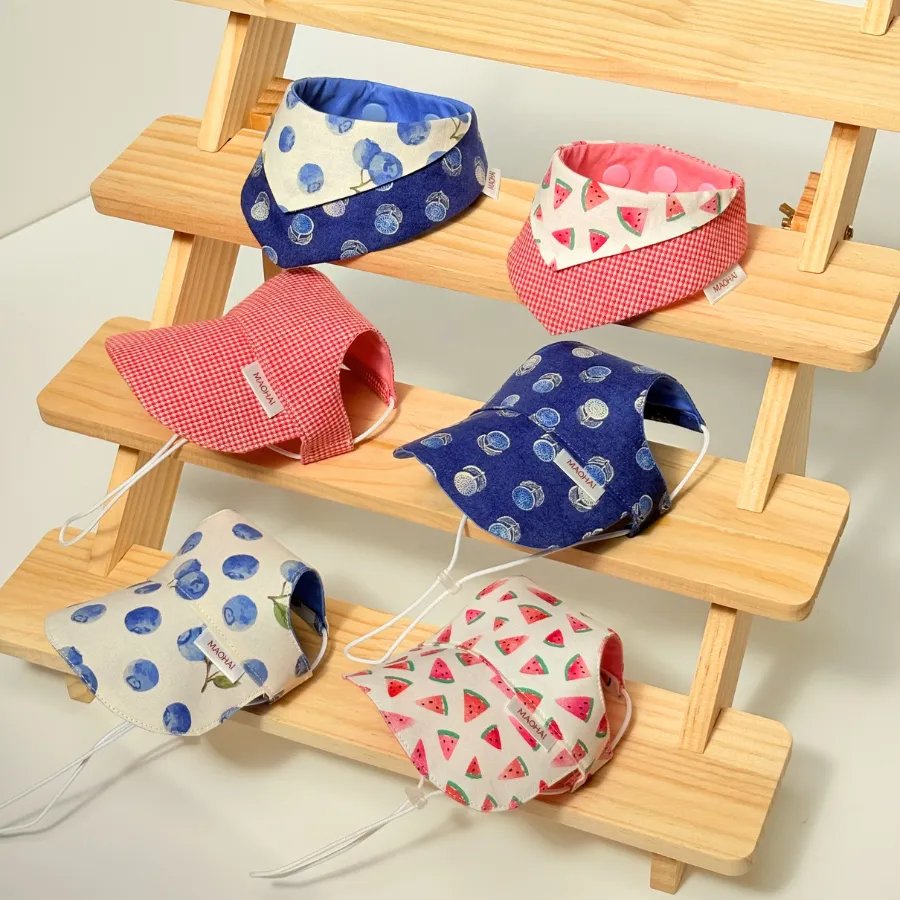 「果實小徑」系列以夏日果實為靈感,延伸出三款清新自然的配件設計 —— 西瓜的紅、藍莓的藍、青梨的綠,在帽子與領巾間悄悄綻放,為毛孩打造一場盛夏果園的浪漫旅行。